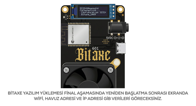 Bitaxe 601 Gamma cihazı sıfırlandığı ve ESP-Miner yazılımı sıfırdan yüklendiği için WiFi ağ bağlantı ayarlarınız ve kripto para cüzdan ayarlarınız işe madencilik havuzu (pool) ayarlarınızı tekrar yapılandırmanız bu aşamada gereklidir.