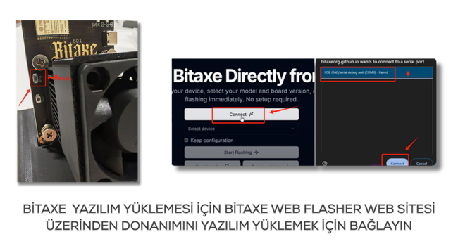 Bilgisayarınızdan Bitaxe.org tarafından desteklenen Bitaxe donanımlarının tümüne yazılım yükleme işleminin kolayca gerçekleştirildiği OSMU topluluğu mühendislerinden X/ @wantclue tarafından geliştirilen şu web sitesine gidin: Bitaxe Yazılım Yükleme ve Format Atma Web Sitesi İçin Tıkla)))