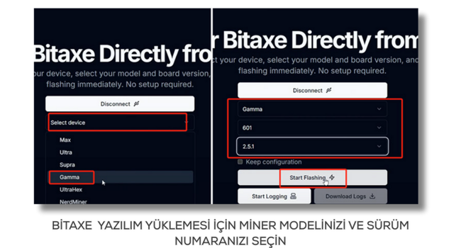 "Start Flashing" (Yüklemeyi Başlat) düğmesine narince tıklayın. İşlem birkaç dakika sürecektir, bu sırada kabloyu çıkarmayın. Yazılım yükleme seviyesini web sitesinin alt bölümünden takip edebilirsiniz. ESP-miner yüklemesi sonrası flash web sitesinde butonlar deaktif olacaktır. Ayrıca site ile 601 Gamma donanımınız arasında bağlatı kesme işlemini buradan gerçekleştirebilirsiniz.