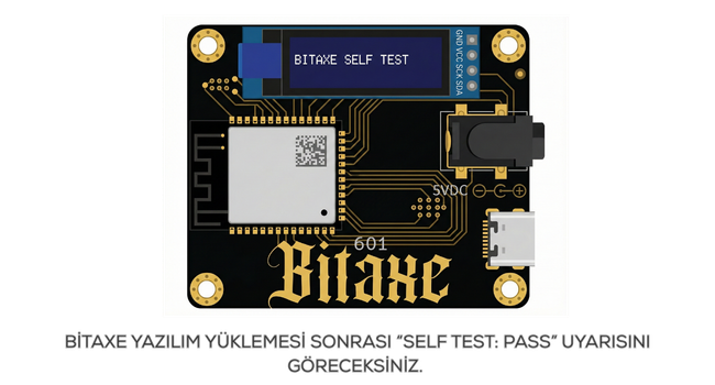 Ayrıca esp-miner yazılımı self test aşamasında pcb üzerinde yer alan tüm bileşenleri ve fonksiyonlarını bir teste tabi tutacaktır.