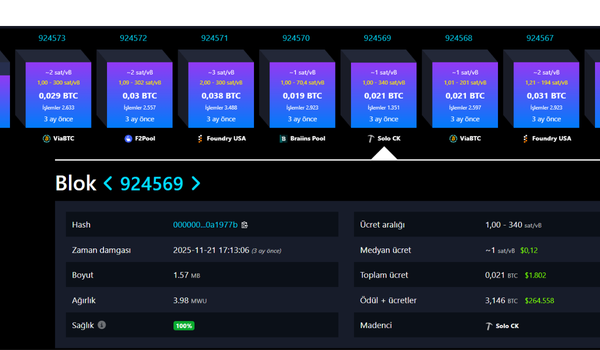 Tarihler geçtiğimiz yıl 22 Kasım 2025, saat 22:13:06'yı gösterdiğinde, ChainCatcher mempool verilerine göre imkansız gibi görünen bir şey gerçekleşti. Bağımsız bir Bitcoin madencisi, ağ devlerine kafa tutarak 924569 numaralı bloğu tek başına kazmayı başardı.