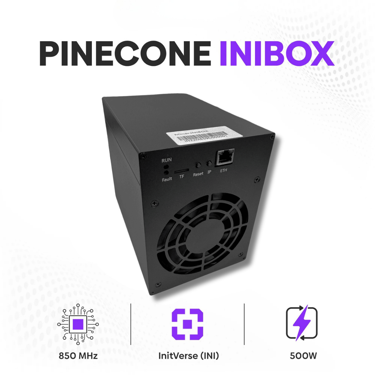 Pinecone Matches INIBOX, InitVerse (INI) blok zincirinde madencilik yapmak için 500 Watt elektrik güç tüketimi ile 850 MH/s VersaHash hashrate karma oranı sunar.